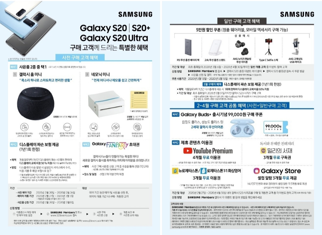 갤럭시 홈 미니, 네모닉 미니, 디스플레이 파손 보험이 적용되며 사전 예약일 이후에 구입한 일반 구매 고객은 무선 충전 배터리 팩 고속 무선충전 스탠드 AKG노이즈캔슬링무선 이어폰 셀피스틱 AKG고해상도USB마이크 등이 제공됩니다.