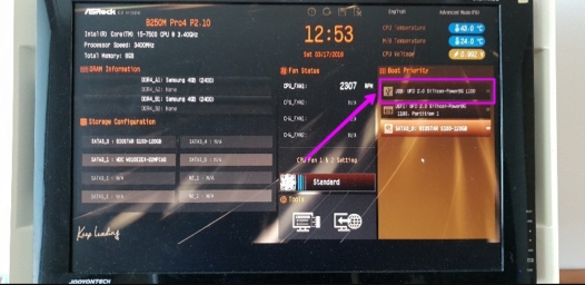 모니터 화면을 보면 정상적으로 ASRock UEFI BIOS모드에 진입했는데요. 오른쪽 Boot 메뉴에 본인이 장착한 USB모델명이 나타나는데 가장 윗부분으로 마우스를 이용해 드래그해서 첫번째인 1번 위치로 변경해 주세요.