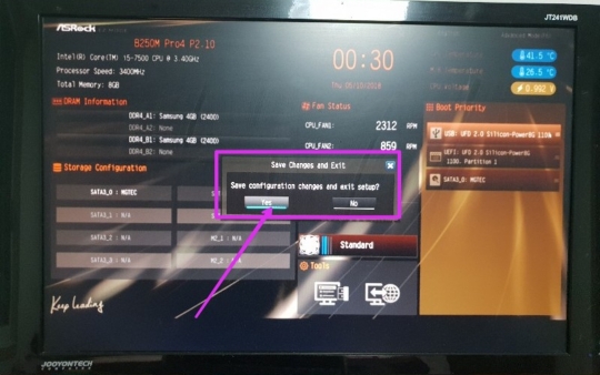 본체 USB포트에 윈도우가 설치된 부팅 메모리를 장착한 후 전원을 켭니다. 에즈락 제조사의 로고가 나타나면 키보드의 F2키 또는 DEL키를 연타로 눌러줍니다.