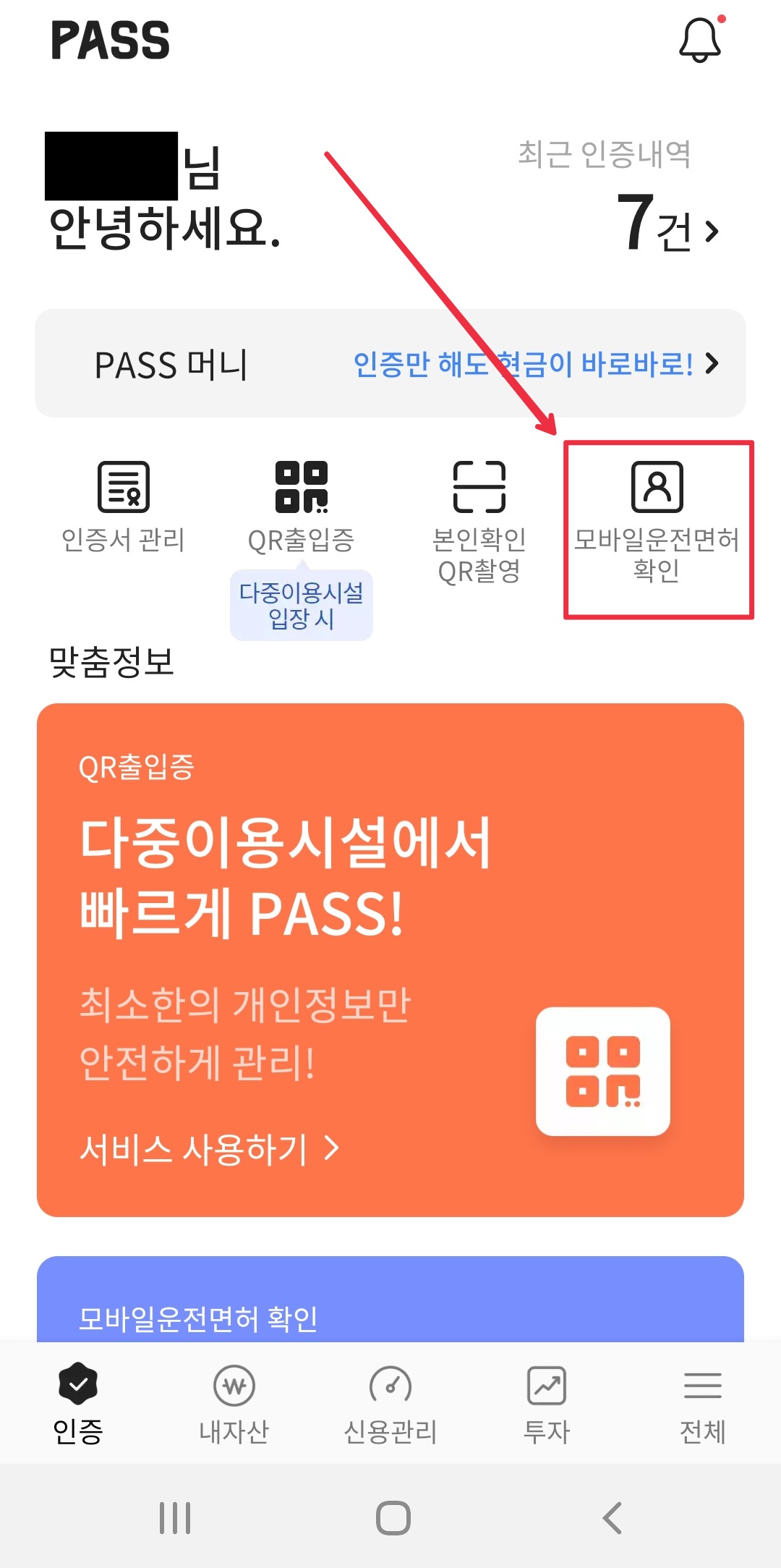 PASS앱을 실행하고 첫 화면의 모바일운전면허 확인서비스 메뉴를 선택하고 안내에 따라 정보를 입력하고 등록하세요.