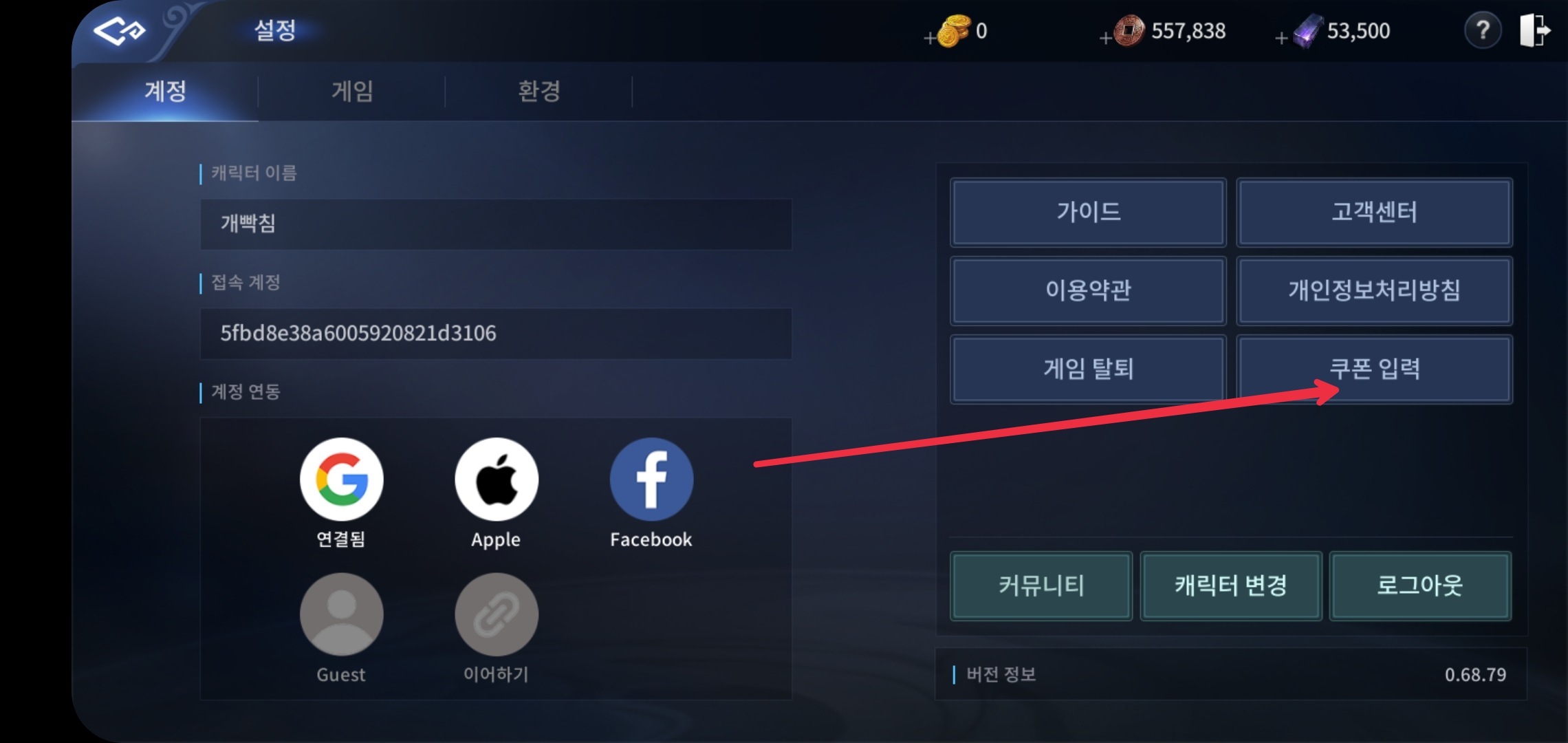 게임 화면 우측 상단의 더보기 메뉴를 터치하면 좌우 UI가 나타나며 우측 하단 시스템 아이콘을 터치해 설정 화면으로 전환됩니다. 이곳에서 쿠폰 번호 메뉴를 터치 입력창이 나타나면 번호를 입력하고 우편함을 통해 수령하세요. 쿠폰은 계정 캐릭터 1회에만 한하며 필요한 캐릭터에서 입력 후 사용하세요.