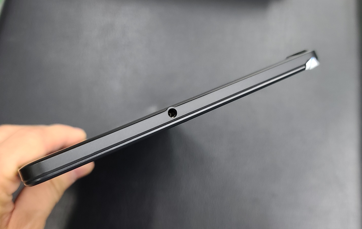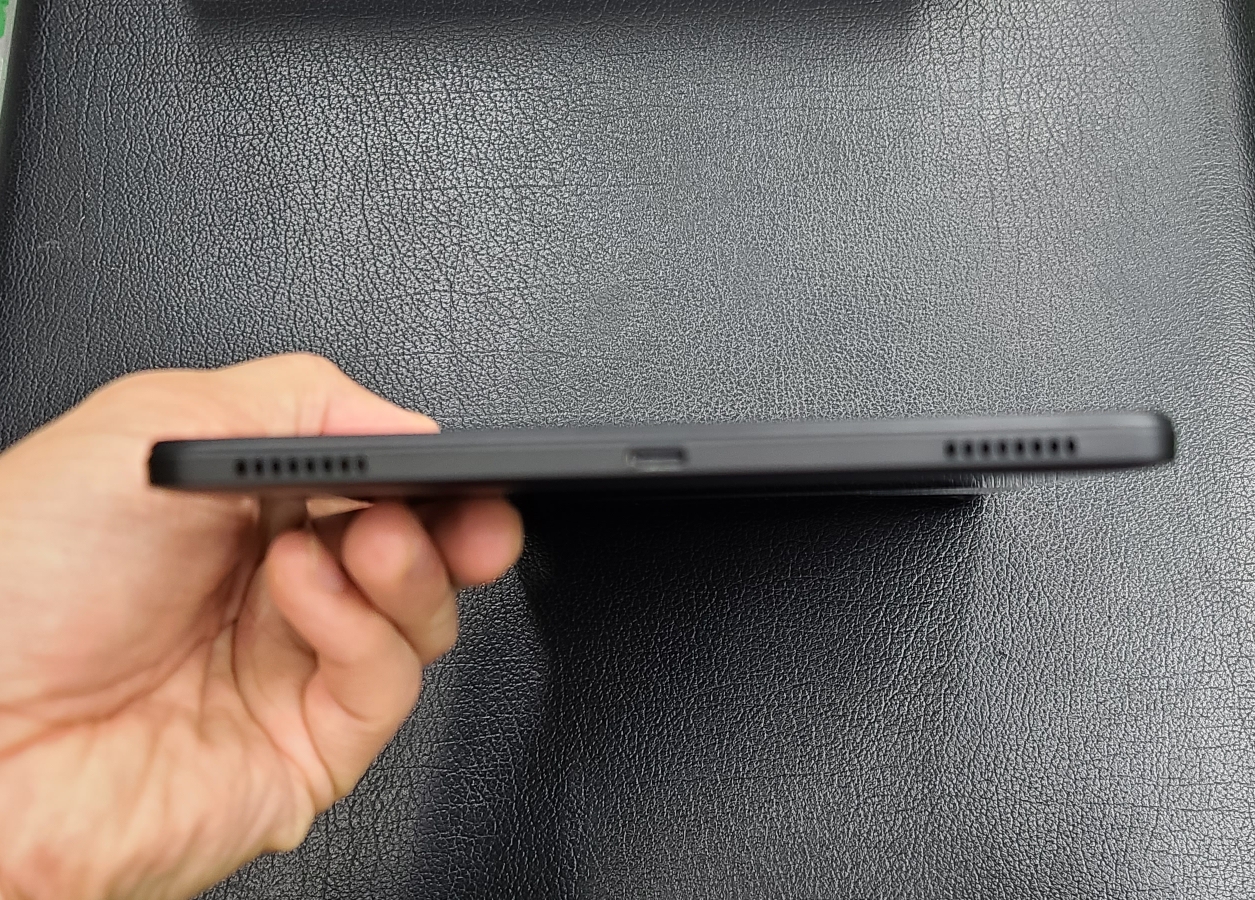 옆면은 전원 버튼, 볼륨 상하 버튼, 하단은 C타입 포트, 2개의 스피커, 상단 중앙에 이어폰 단자가 위치해 있습니다.