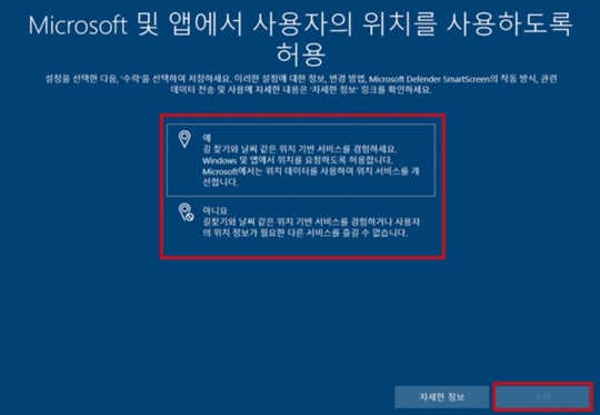 Microsoft 및 앱에서 사용자의 위치를 사용하도록 허용 화면에서 위치를 허용할지 예, 아니오를 선택 후 수락을 클릭합니다.