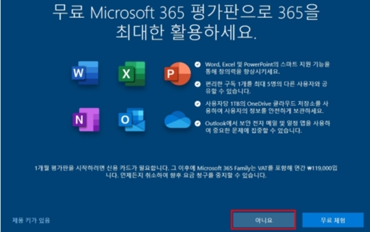무료 Microsoft365 평가판 체험 신청 화면인데요. 아니요를 선택합니다. 무료 체험 버튼을 클리하면 체험판 1개월 사용이 가능하니 참고하세요.