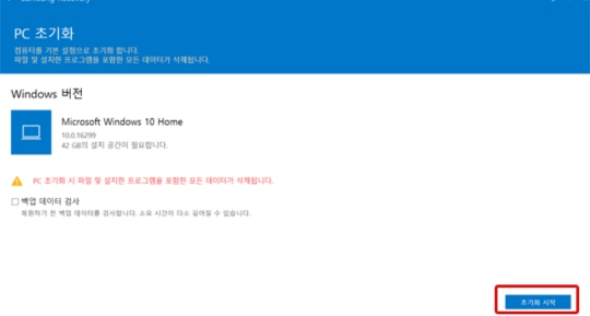 PC초기화 창에서 초기화 시작버튼을 클릭해 주는데요. 백업 데이터 검사 버튼에 체크 후 진행하셔도 됩니다.