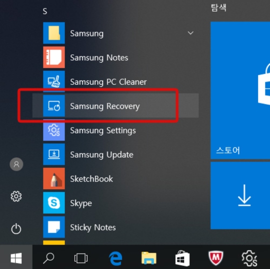 PC가 정상 부팅되는 상태에서는 윈도우10 바탕화면에서 시작버튼을 클릭한 후 메뉴에서 Samsung Recovery를 선택해 클릭해 줍니다.