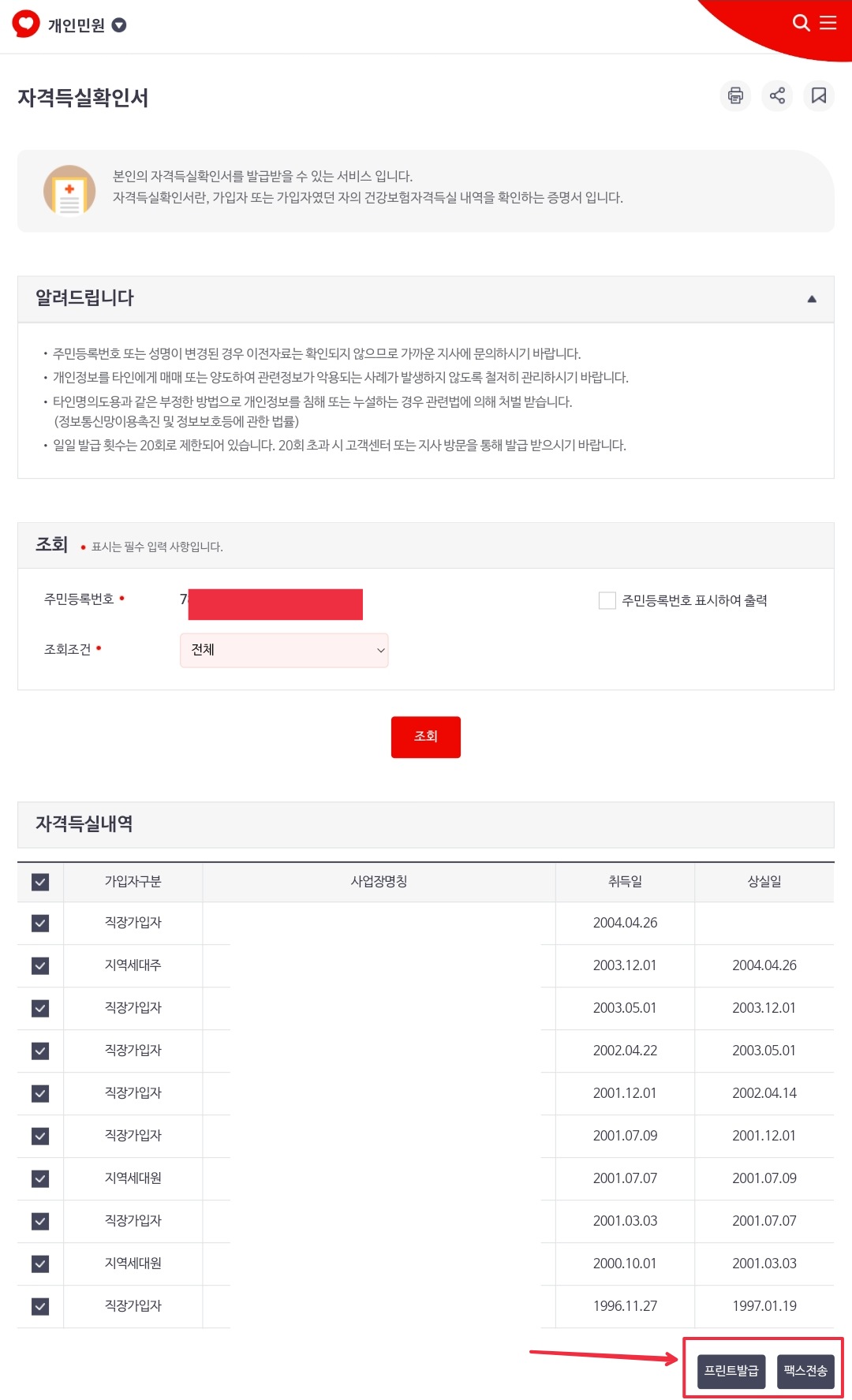 로그인 상태로 화면이 전환되면 조회에서 본인 주민등록번호와 조회 조건을 선택해 자격득실내역을 가입한 기간에 따라 과거순부터 확인할 수 있습니다. 하단에는 프린터발급ㄱㆍ다 팩스전송 버튼을 통해 건강보험 자격득실확인서를 프린터 발급하거나 팩스로 전송해 사용하시면 됩니다.