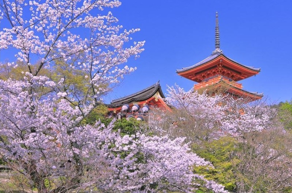 소메이요시노와 산벚나무가 합해 약 1500그루 피는 세계 유산의 고찰. 본당을 벚꽃이 둘러싸는 경치를 즐길 수 있는 오쿠노인으로부터의 경치나, 시미즈의 무대에서 내려다보는 벚꽃의 경관이 절경
