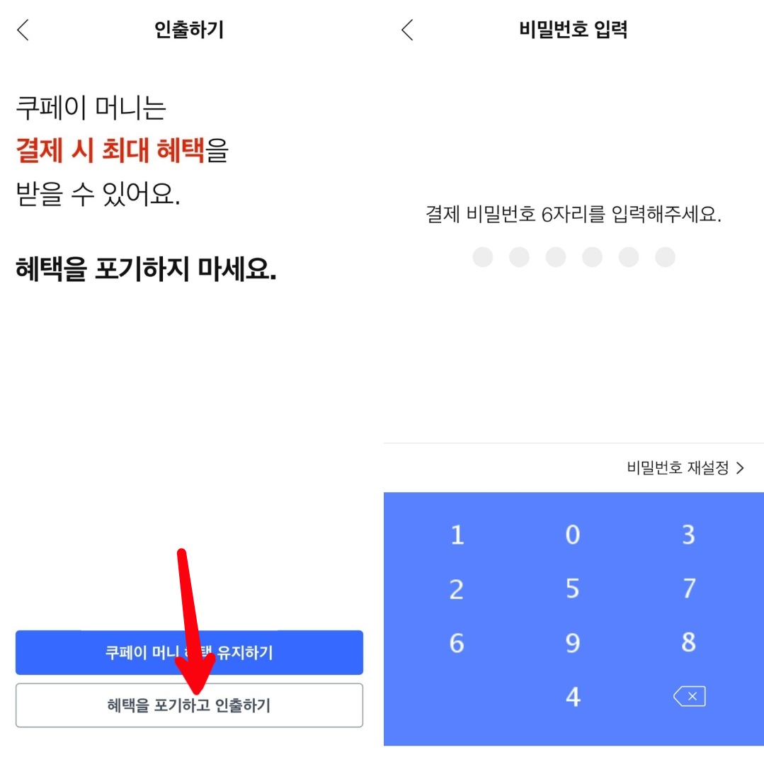 인출하기 화면으로 전환되면 쿠페이 머니에 대한 혜택을 한번더 묻는데요. 혜택을 포기하고 인출하기를 터치하고 결제 비밀번호 6자리를 입력하면 인출의 모든 과정이 완료됩니다.