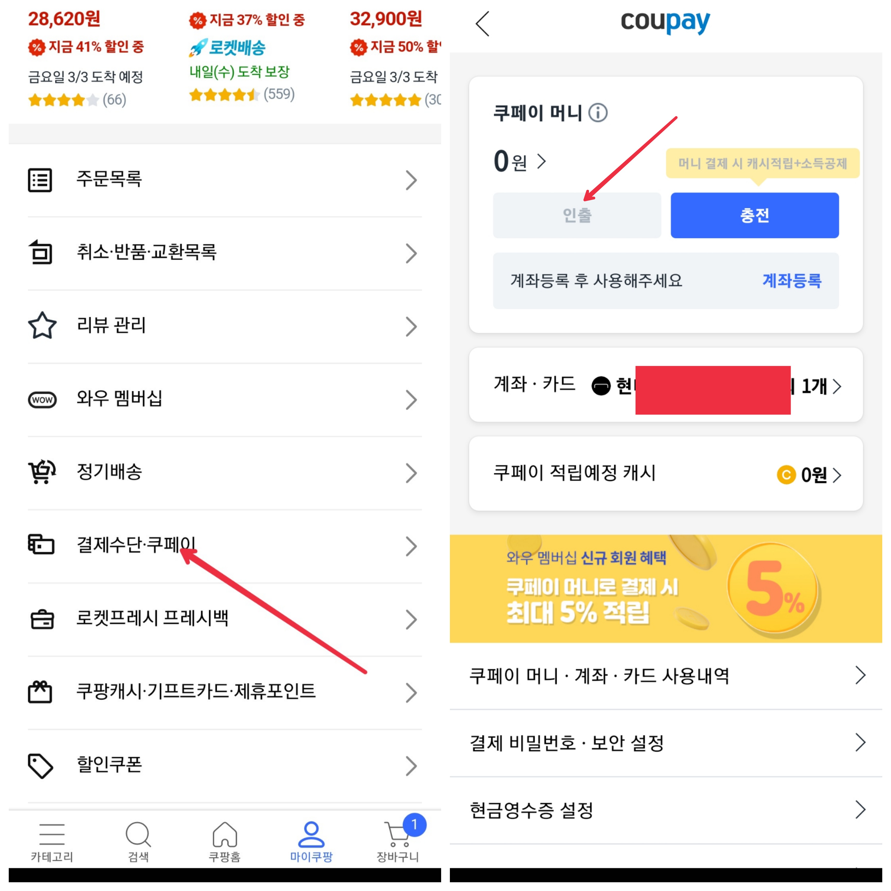 모바일 기준으로 인출 방법을 설명하면 앱의 하단 마이쿠팡을 선택합니다. 마이쿠팡 메뉴에서 결제수단 쿠페이 메뉴를 터치해 주세요. 쿠페이 머니 화면이 전환되면 현재 금액 아래 인출 버튼을 터치해 주세요.