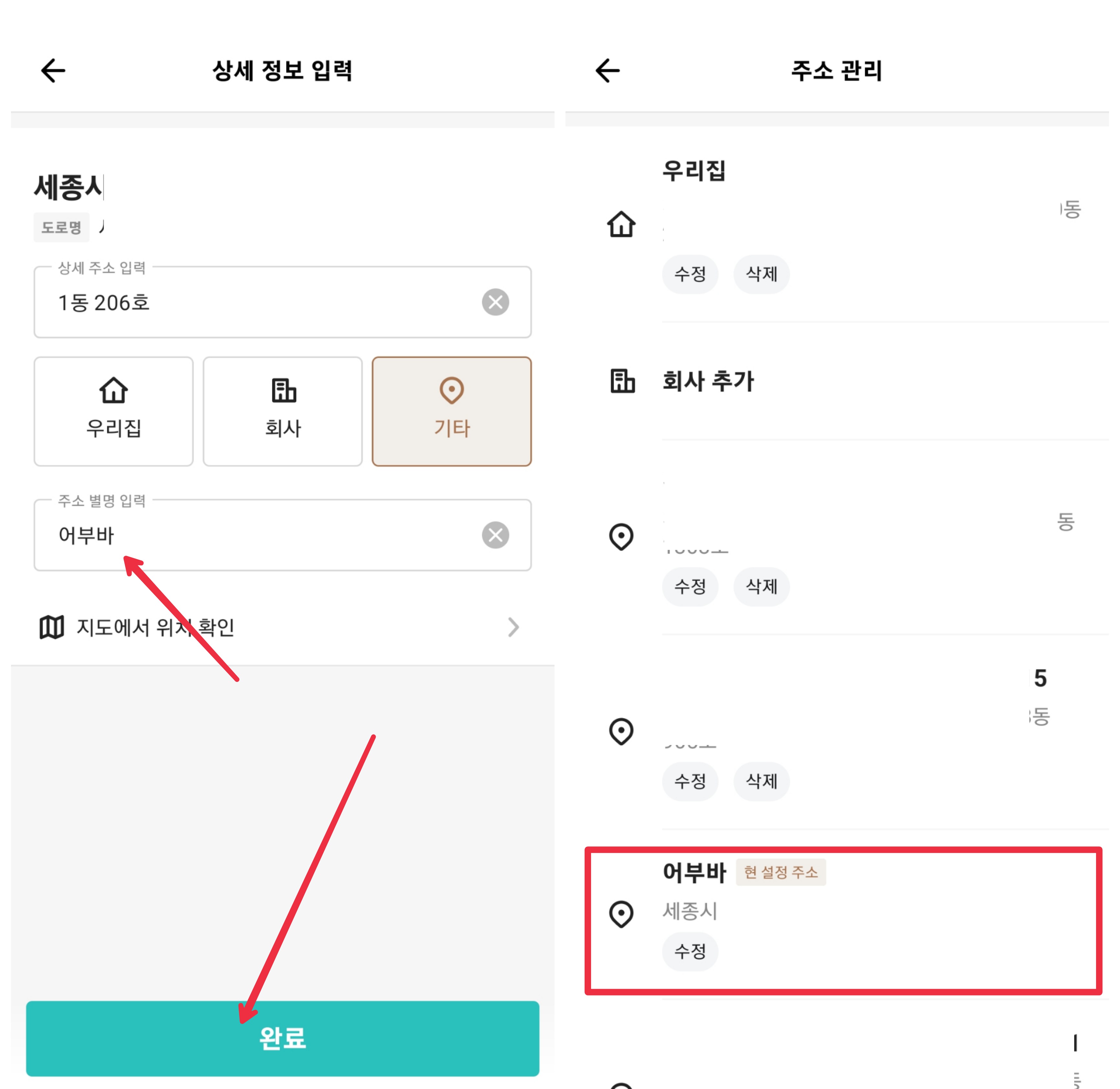 상세 정보 입력에 주소와 별명을 입력하고 완료를 터치하면 주소관리 화면에서 우리집 이외의 주소가 추가된 것을 확인할 수 있습니다.
