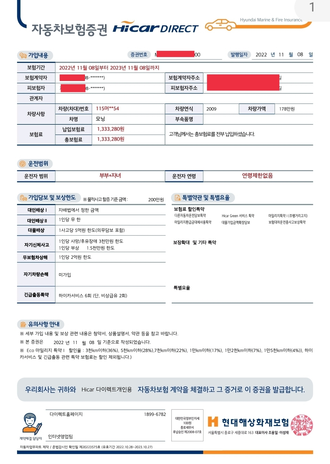 보험증서에 가입된 보장 내용이며 일반적인 가입 기준에 충족하는 보장 내용인데요. 워낙 보험료가 비싸다보니 자차는 가입하지 않았습니다. 연식이 있는 중고차이기도 하고 금액 부담이 컸기 때문이었는데요. 자차 추가시 30만원이 더해져 160만원 가까이 견적이 나오게 됩니다.